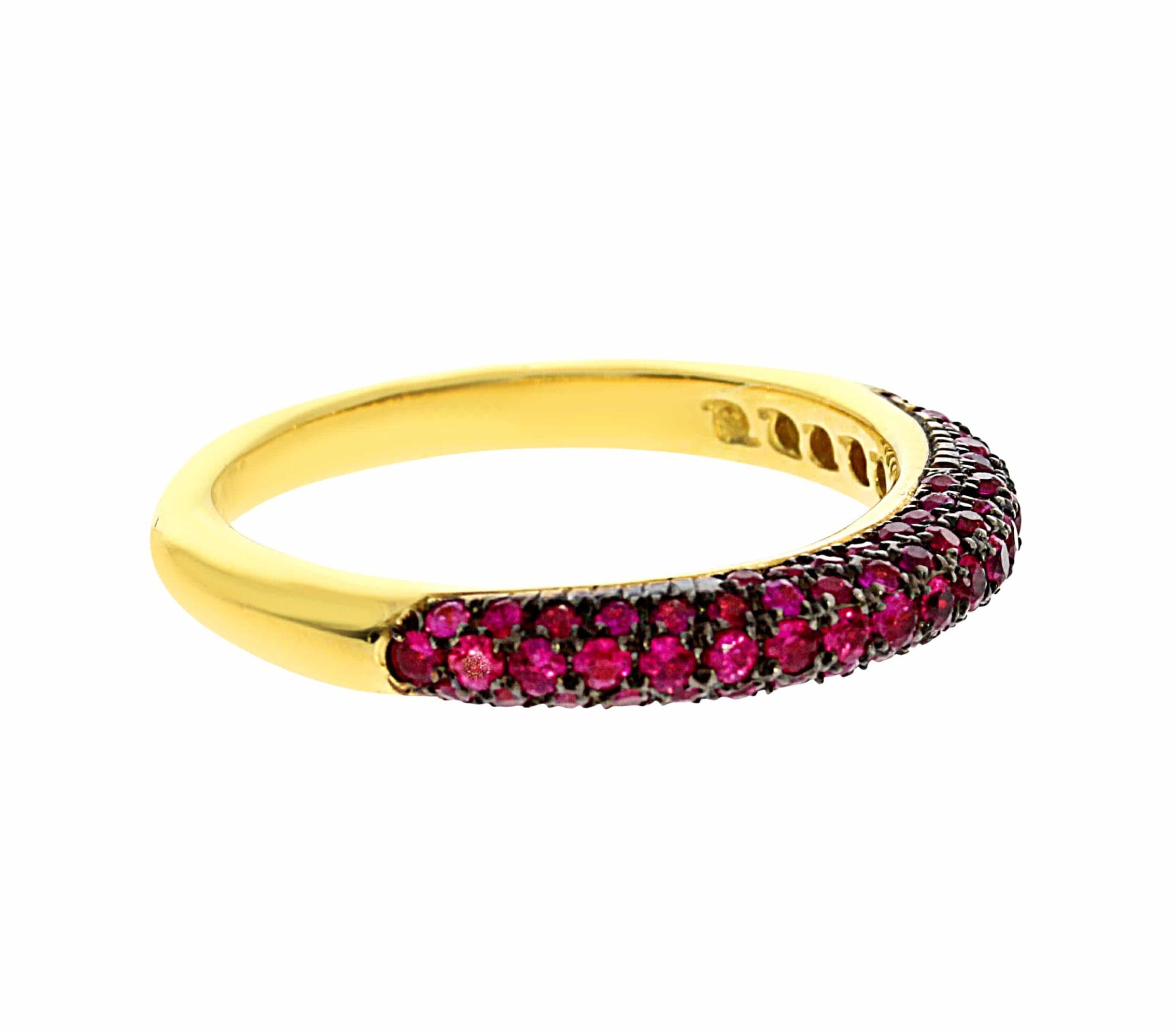 טבעת חצי איטרניטי מעוצבת מזהב צהוב 14 קראט בשיבוץ 73 אבני רובי מובחרות במשקל כולל של 0.72 קראט.